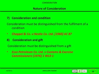 Nadarajah 1980 Your Bibliography. The case of Carlill v Carbolic Smoke Ball Co IBID is an example of executed consideration where the defendants advertised the promise of a reward for persons to use their smoke balls in a certain manner. Nature of Consideration 1 The price that the promisee pays for the promise of the promisor the price for which the promise of the other is bought 2 Given in return for the promise The promisee or the third party gives the consideration in return exchange for the promise made by the promisor.